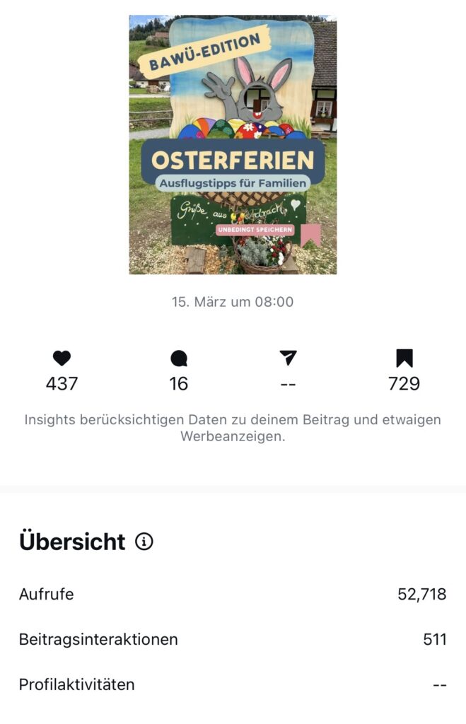 Ein thematischer Instagram-Beitrag, in dem wir mehrere Ausflugsziele bündeln und an 52.000+ Familien ausspielen.